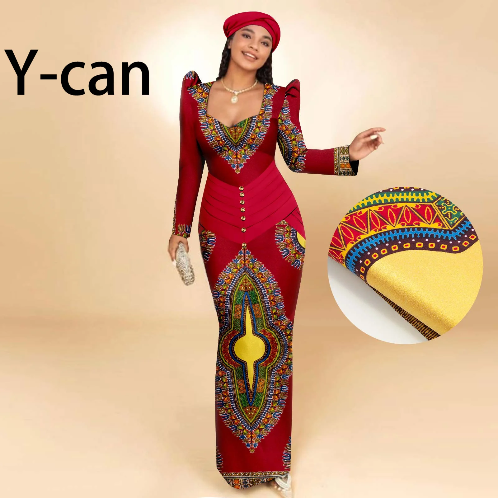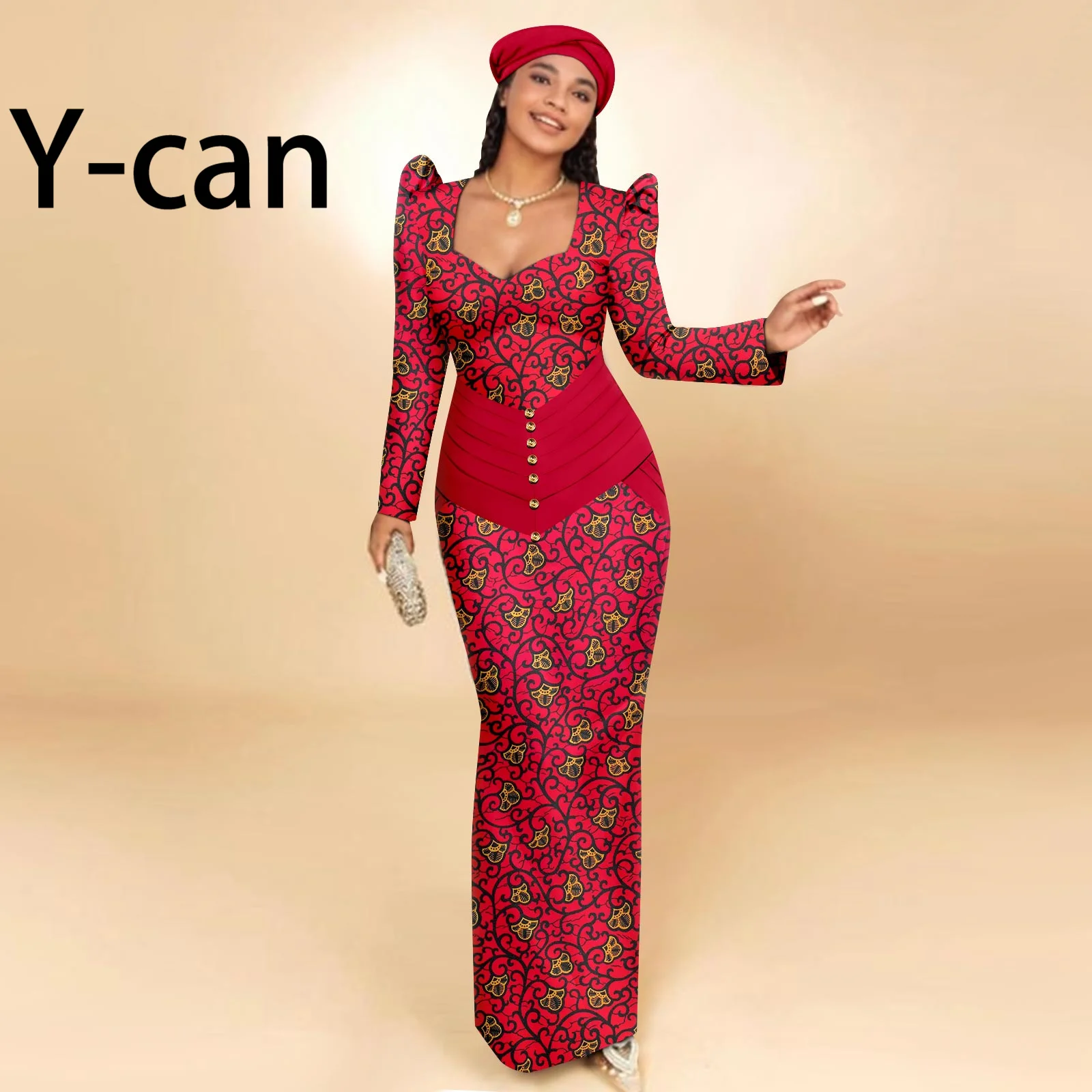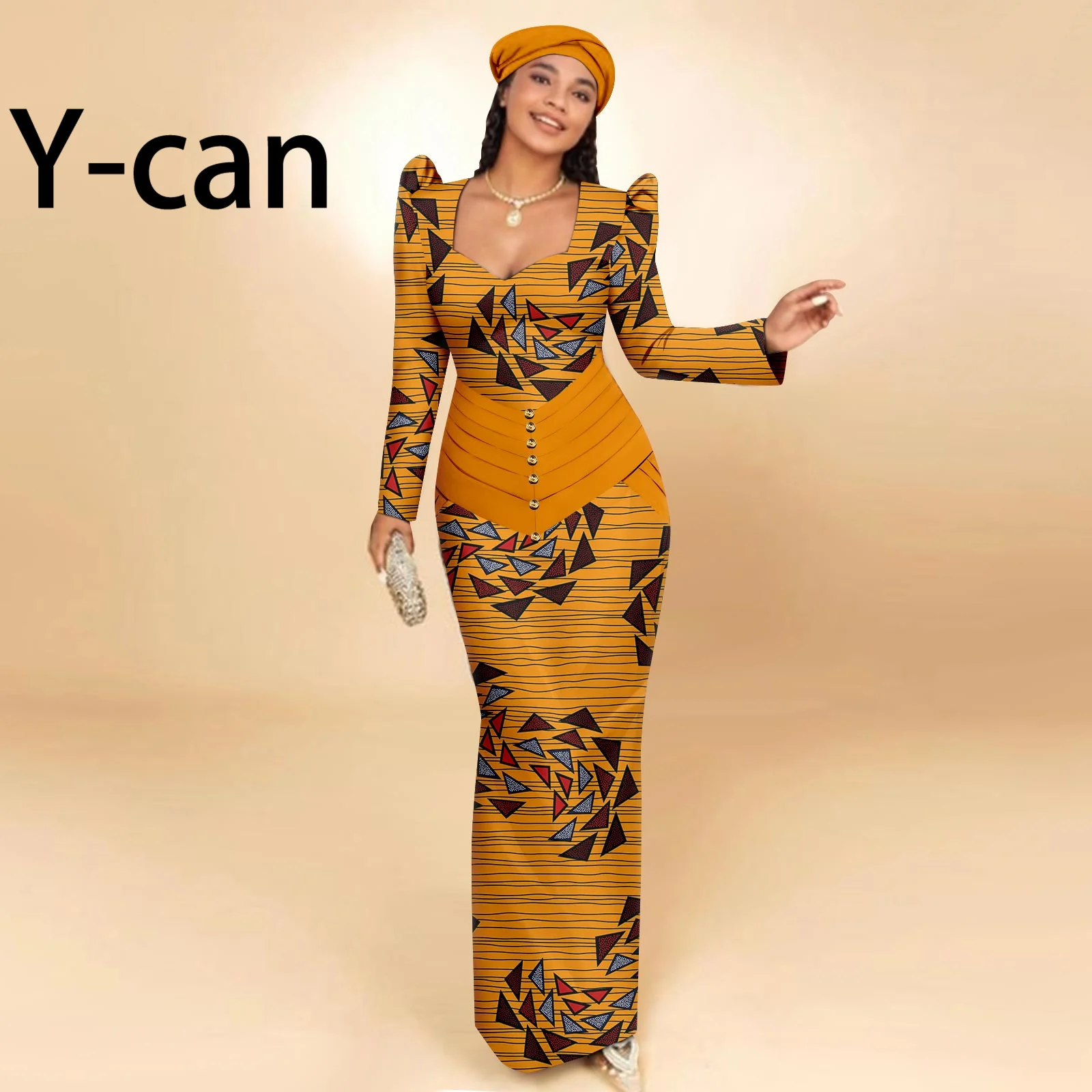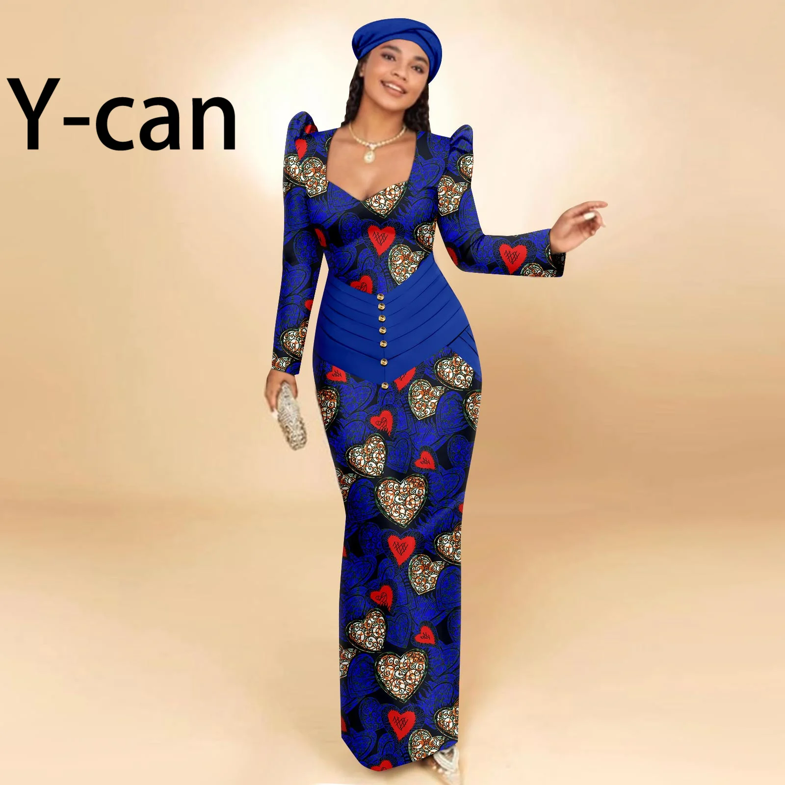 Buy African Party Dresses for Women Long Sleeve Heart-collar Dress with Free Headscarf for Wedding Party Elegant Lady Dress 2425129