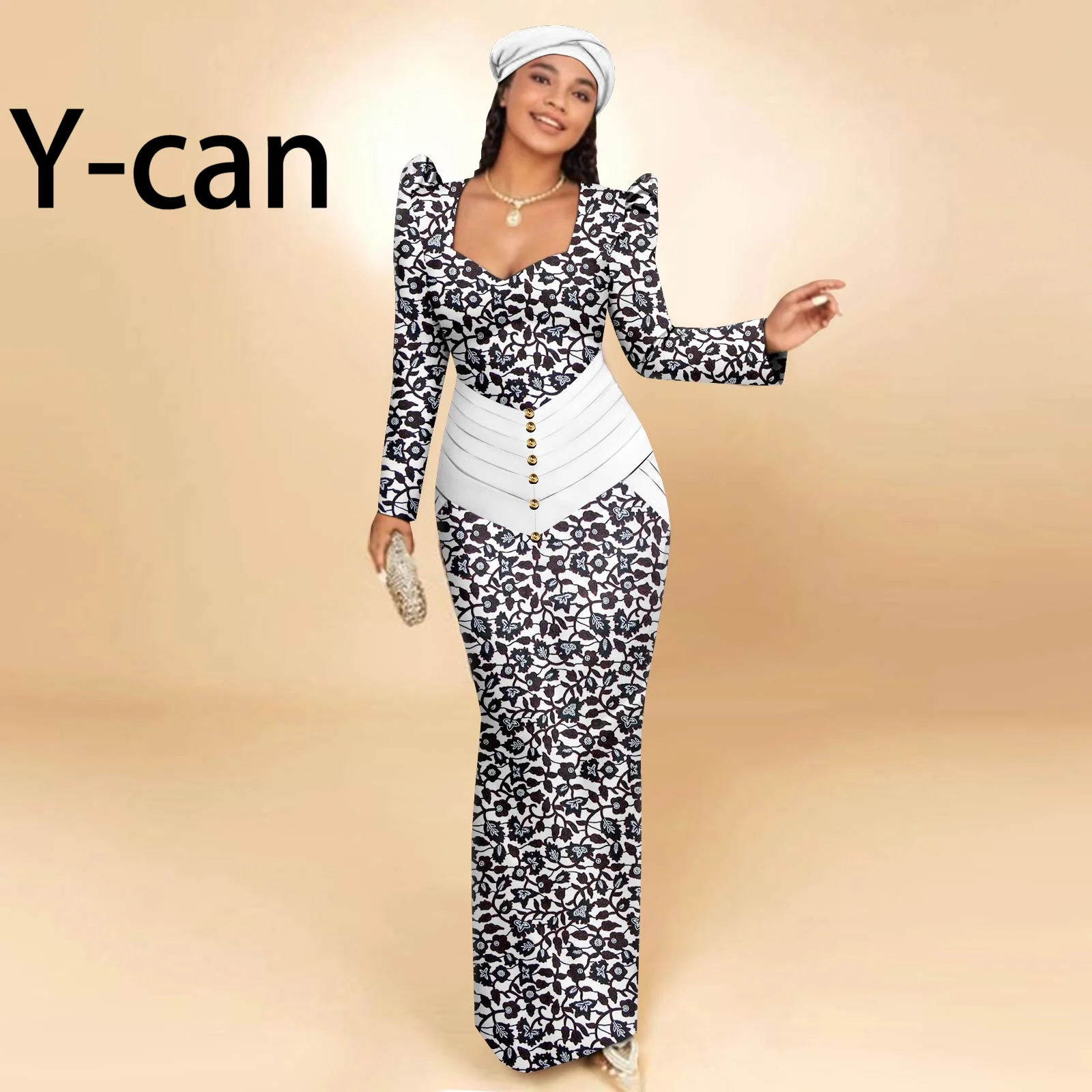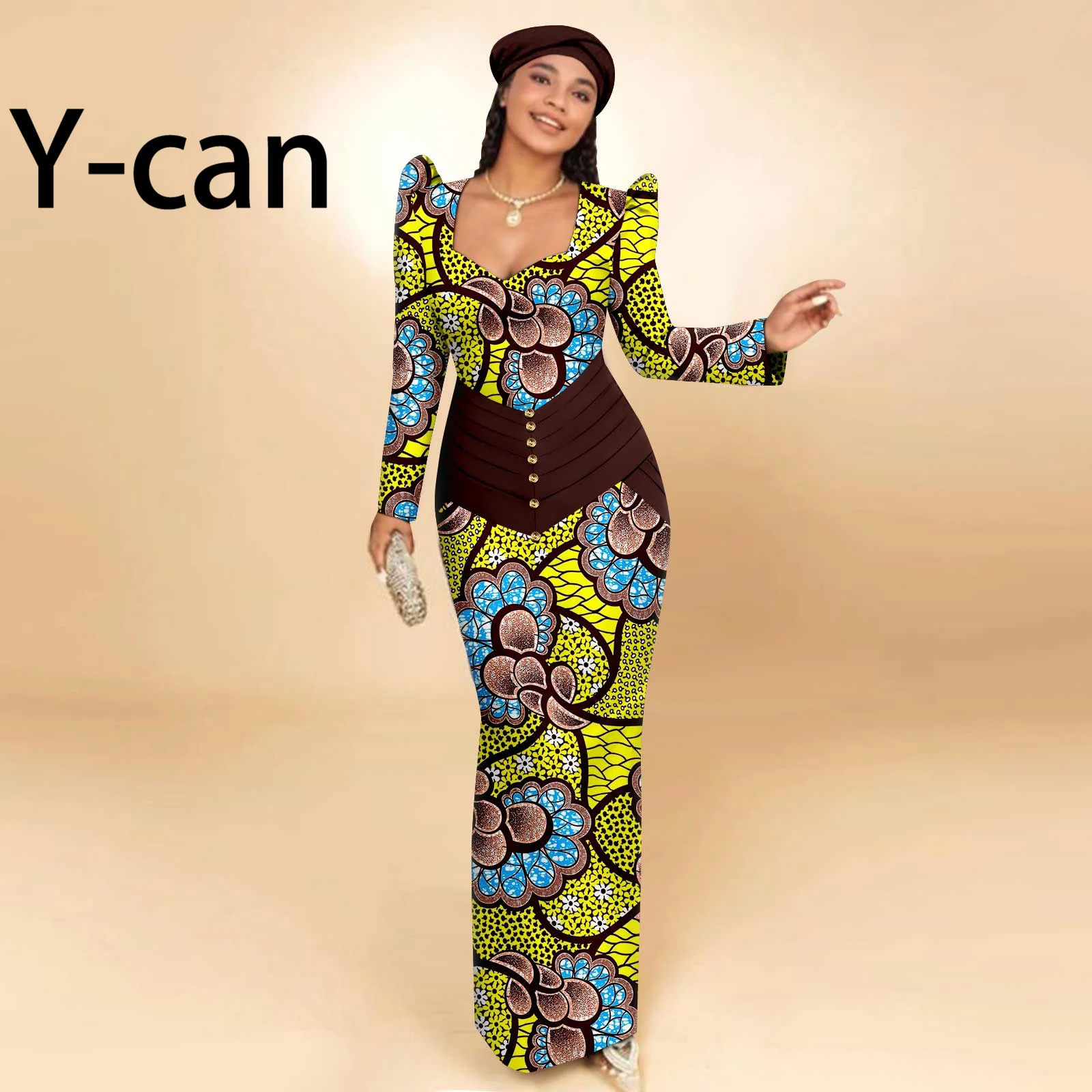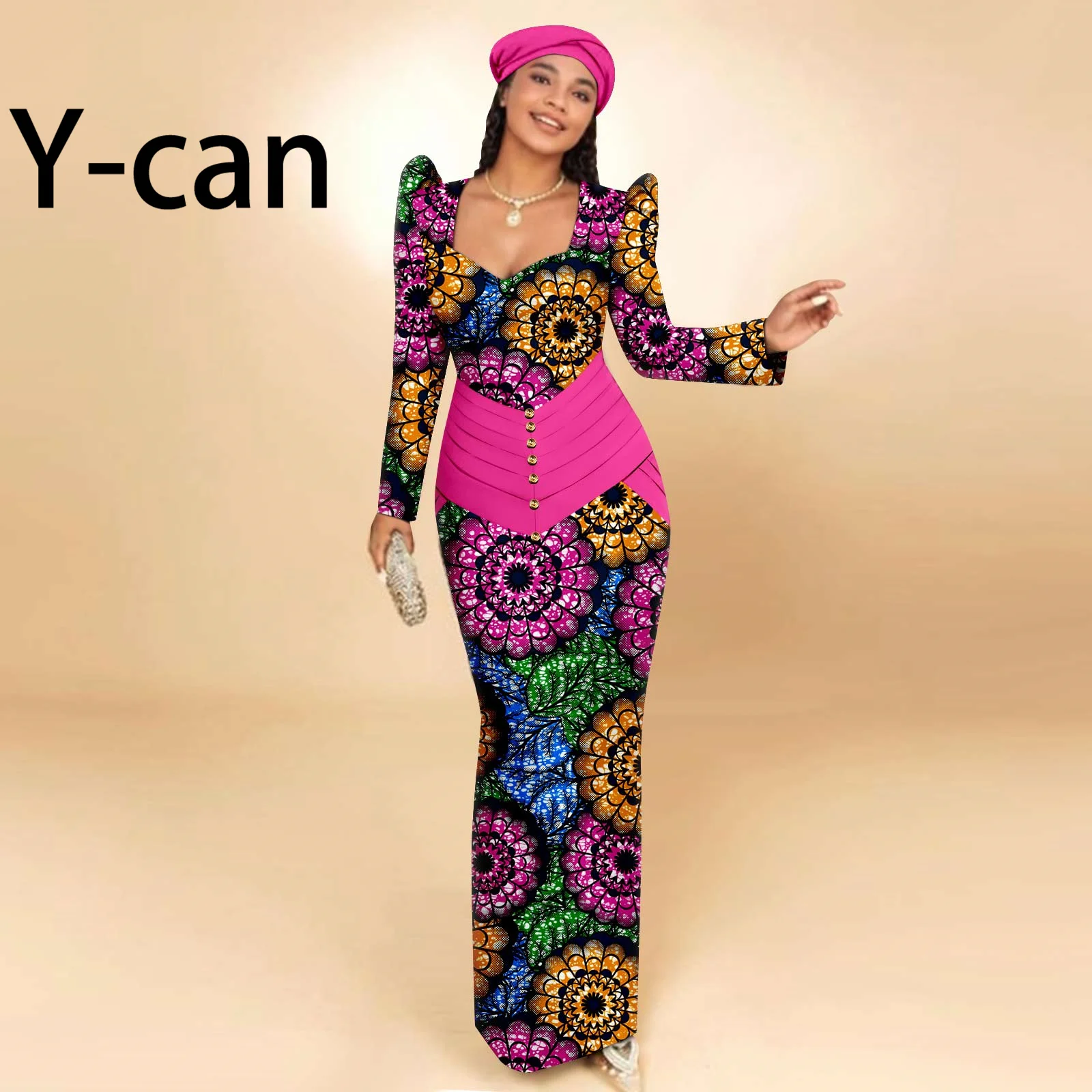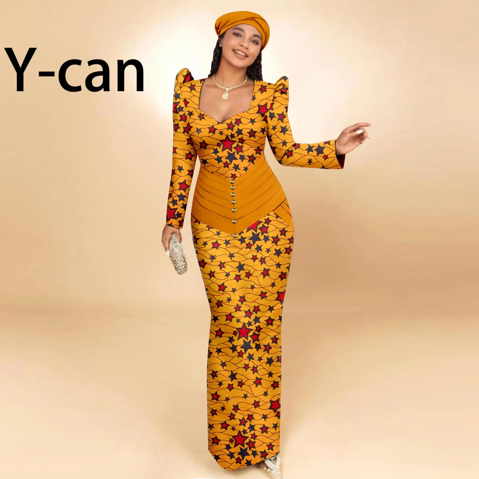 Buy African Party Dresses for Women Long Sleeve Heart-collar Dress with Free Headscarf for Wedding Party Elegant Lady Dress 2425129