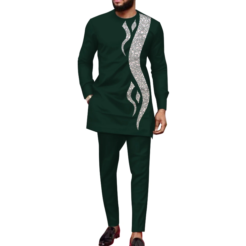 Bazin Riche African Clothes for Men 2 Pieces Set Long Sleeve Shirt and Trousers Dashiki Men Suits African Men Boubou Wyn1588
